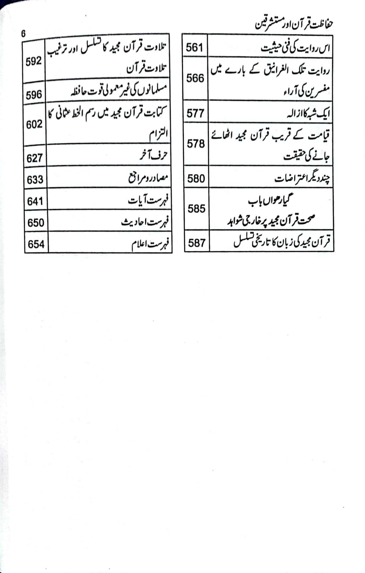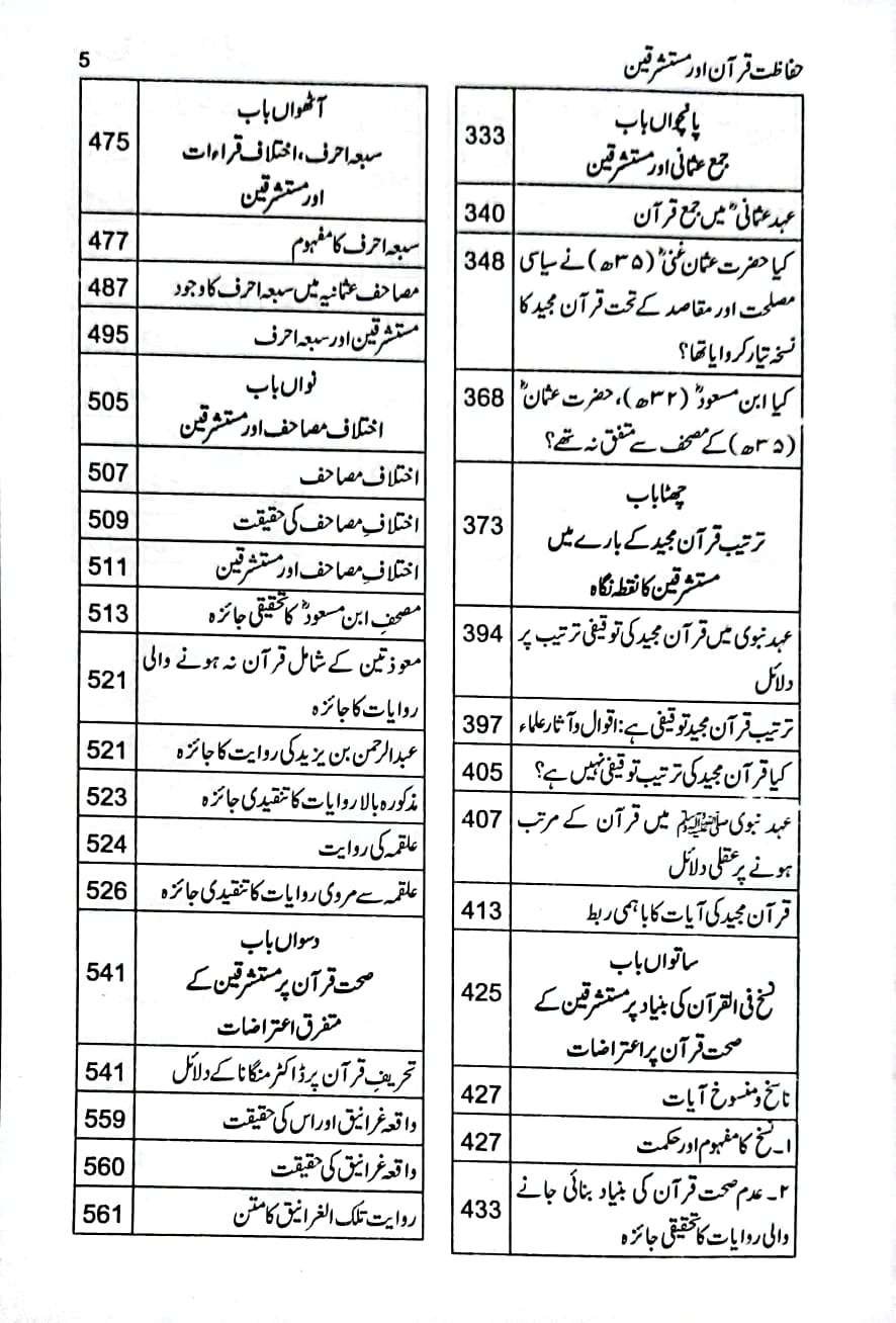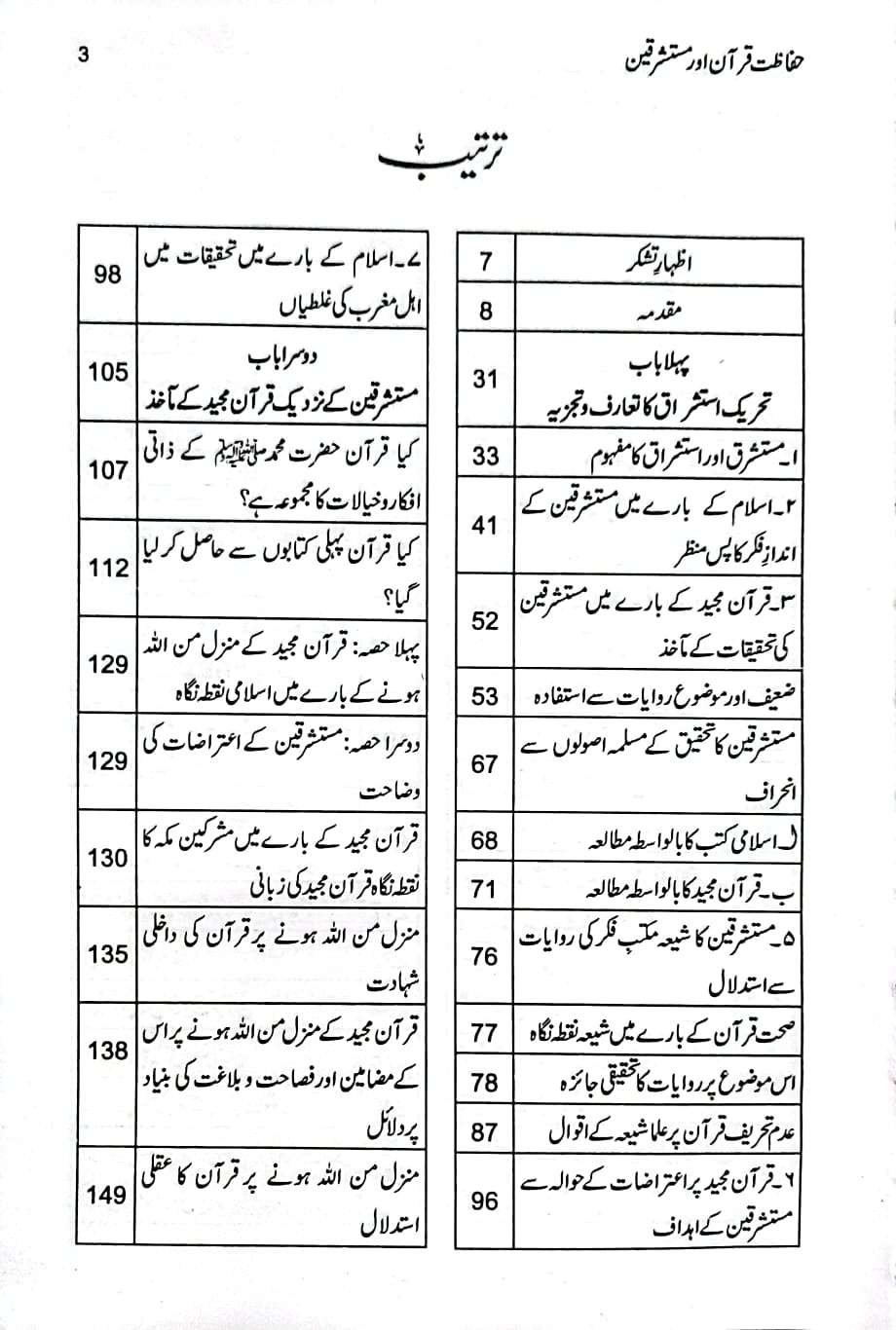 انسانوں کی ھدایت کیلٸے اللہ تعالی نے نبوت و رسالت کے جس سلسلے کا آغاز حضرت آدم علیہ السلام سے کیا تھا قرآن کریم اس سلسلہ کی آخری کڑی اور کامل کڑی ہے. جس نے اس ھدایت کی پیروی کی وہ کامیاب و کامران ہو گا اور جس نے اس کی خلاف وردی کی وہ ناکام و نامراد ہو گا اور اللہ نے قرآن کریم میں اس کو آخری کڑی قرار دینے کا اعلان اس میں باربار فرمایا اس کتاب میں حفاظتِ قرآن کے تمام پہلوں کو زیرِ بحث لایا گیا ہے اور تحریک استشراق کا تعارف اور تجزیہ بھی کیا گیا ہے. دوسرے باب میں مستشرقین کے نزدیک قرآن مجید کے مآخذ اور مستشرقین کے اعتراضات کی وضاحت بھی کی گی ہے