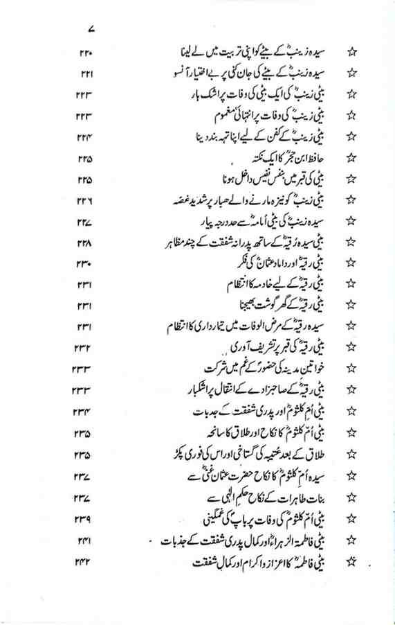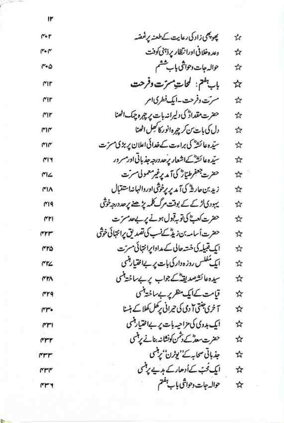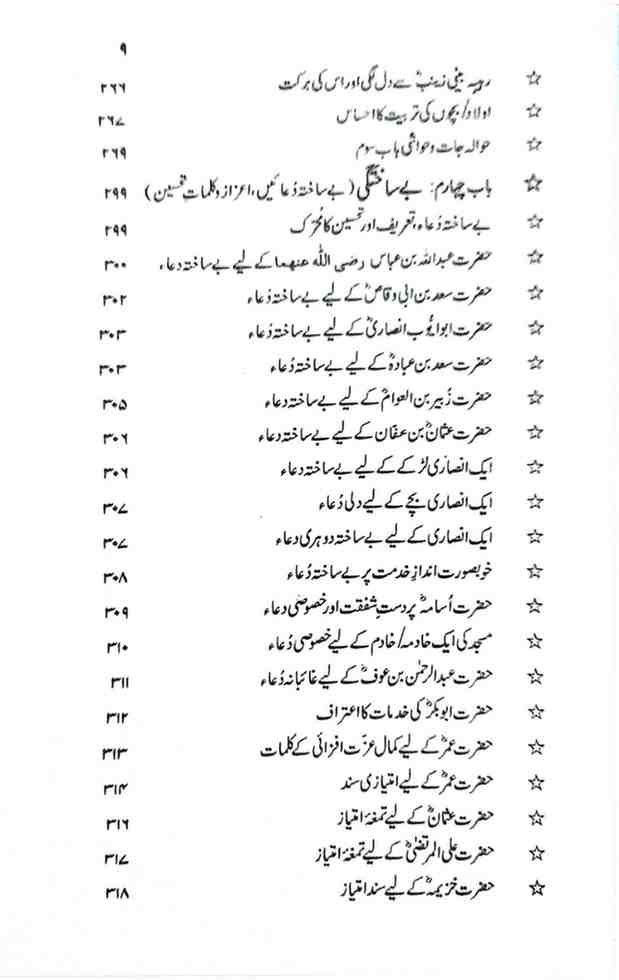 باب چہارم بےساختگی (بےساختہ دعائیں،اعزاز و کلماتِ تحسین) ، باب پنجم رقتِ قلبی باب ششم آبگینہ جذبات اور باب ہفتم لمحاتِ مسرت و فرحت جیسے موضوعات شامل ہیں