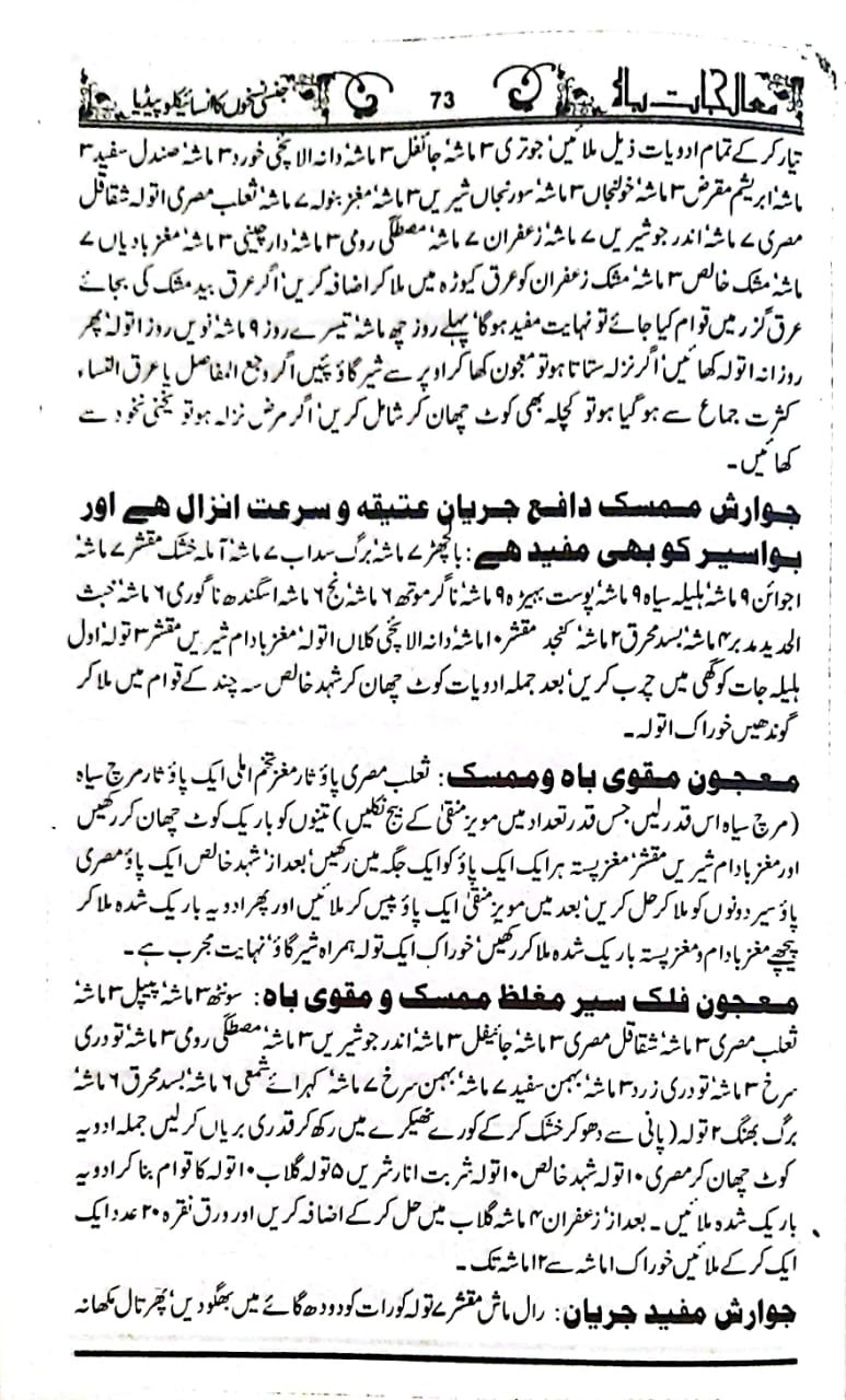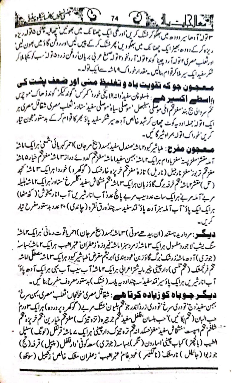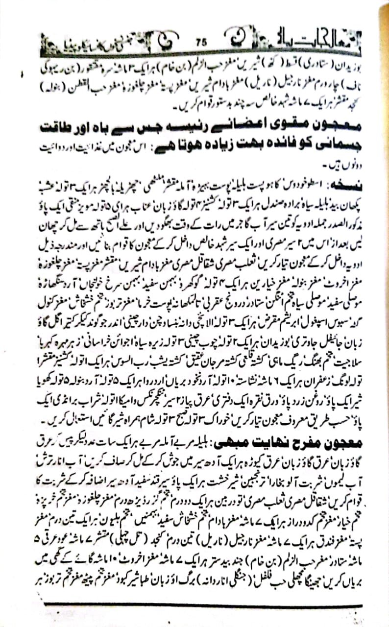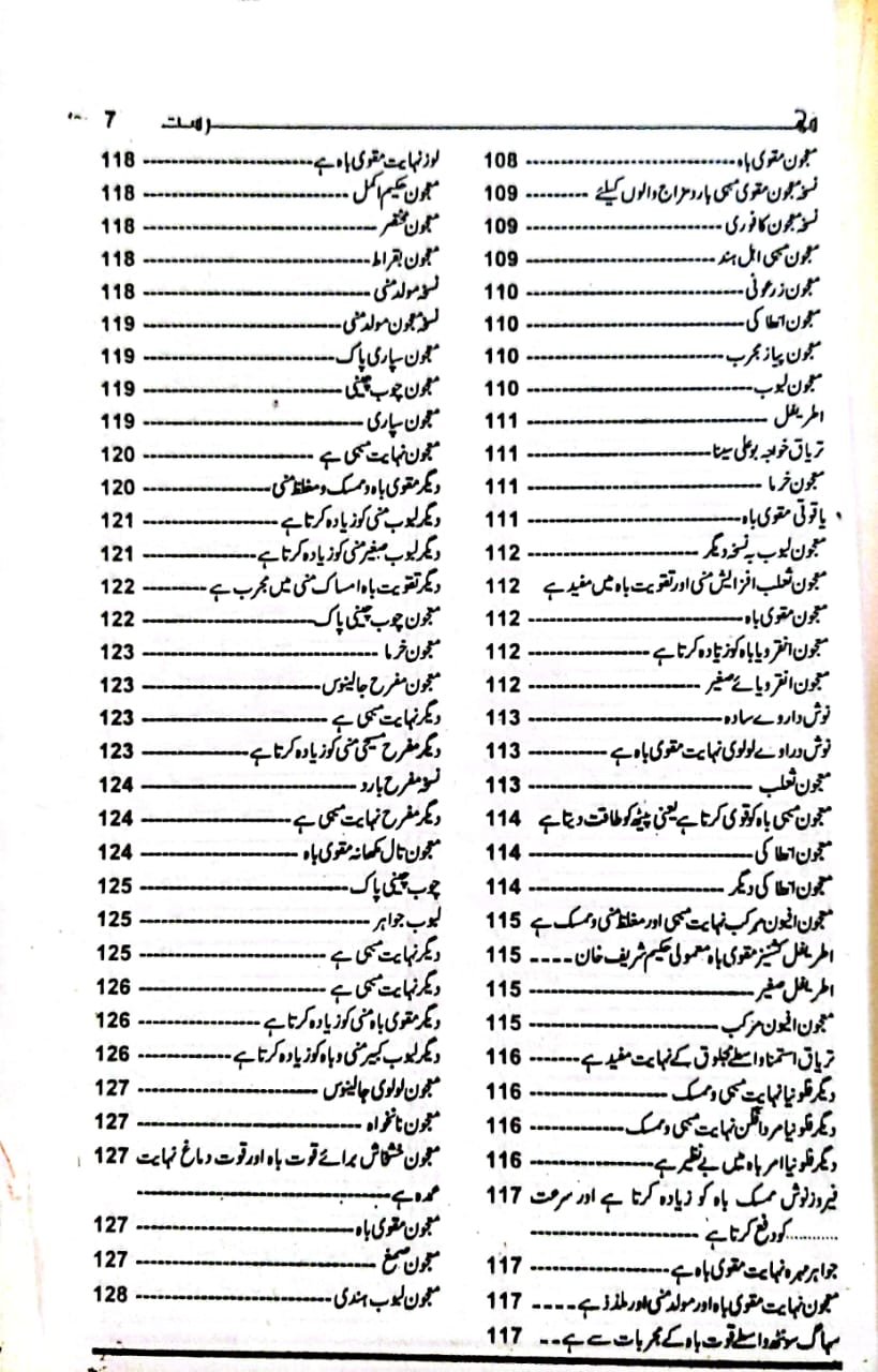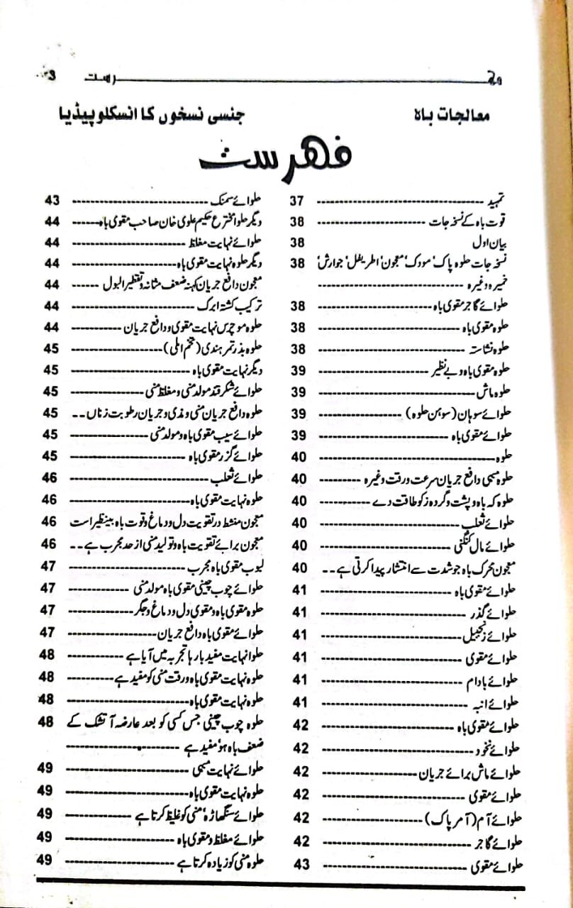 مردوں کی امراض جنسی کی ادویات برصغیر میں جس قدر لوگوں کو معلوم ہیں۔ اور کتب میں جس قدر لکھی ہیں دوسرے ممالک کے اگر ساری دنیا کے نسخہ جات کو اکٹھا کیا جائے تو بھی اتنی نہیں بن سکتی ہیں۔ سار دنیا چند چیزوں کے اردگرد گھومتی ہے۔ ہمارا یہ ارادہ ہوا کہ ہم بڑی بڑی تمام کتب سے ویسے تمام نسخہ جات کو اکٹھا کر کے ایک کتابی شکل میں لے آئیں اور اسی میں بڑے بڑے وئیدوں ‘ حکیموں سے حاصل کردہ نسخہ جات بھی درج کردیں یہ ایک ایسی کتاب ہو جائے جس کے پہلے نظیر نہ ہو اور کوئی نسخہ ایسا نہ ہو اور کوئی نسخہ ایسا نہ ہو جو اس میں نہ ہوتا کہ طبیب و مریض دونوں مستفیض ہوں کسی کو پھڑکنے کی ضرورت نہ رہے۔ جیسی دوائی چاہے بنائے استعمال کرے یا کروائے ۔ اس سے پہلے کبھی اتنے نسخہ جات اکٹھے نہیں کئے اور اس حصے میں تمام چھپی کتب اور بے شمار قلمی کتب کے اچھے نسخہ جات لوگوں کے سینوں کے راز سب آگئے ہیں۔