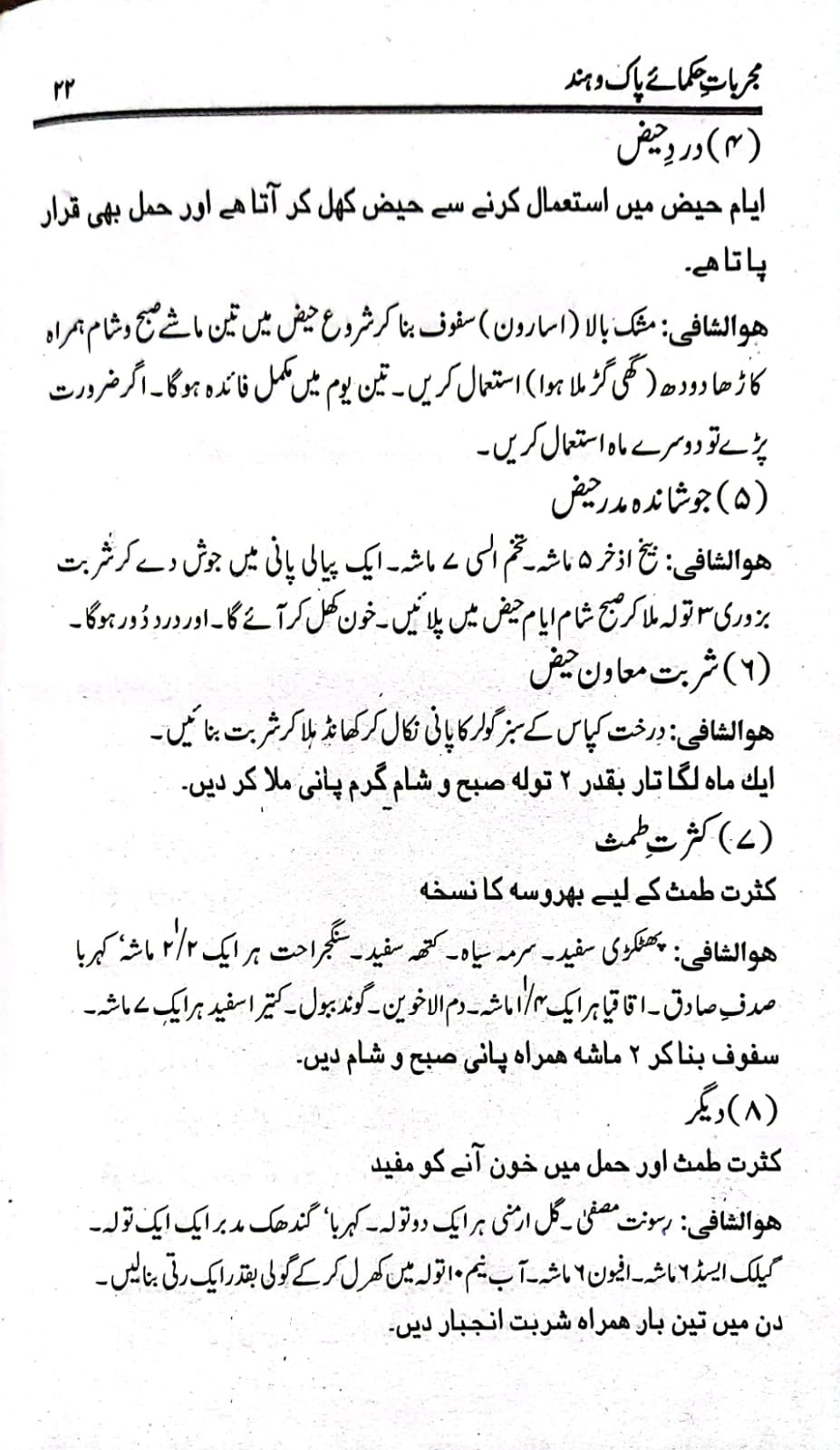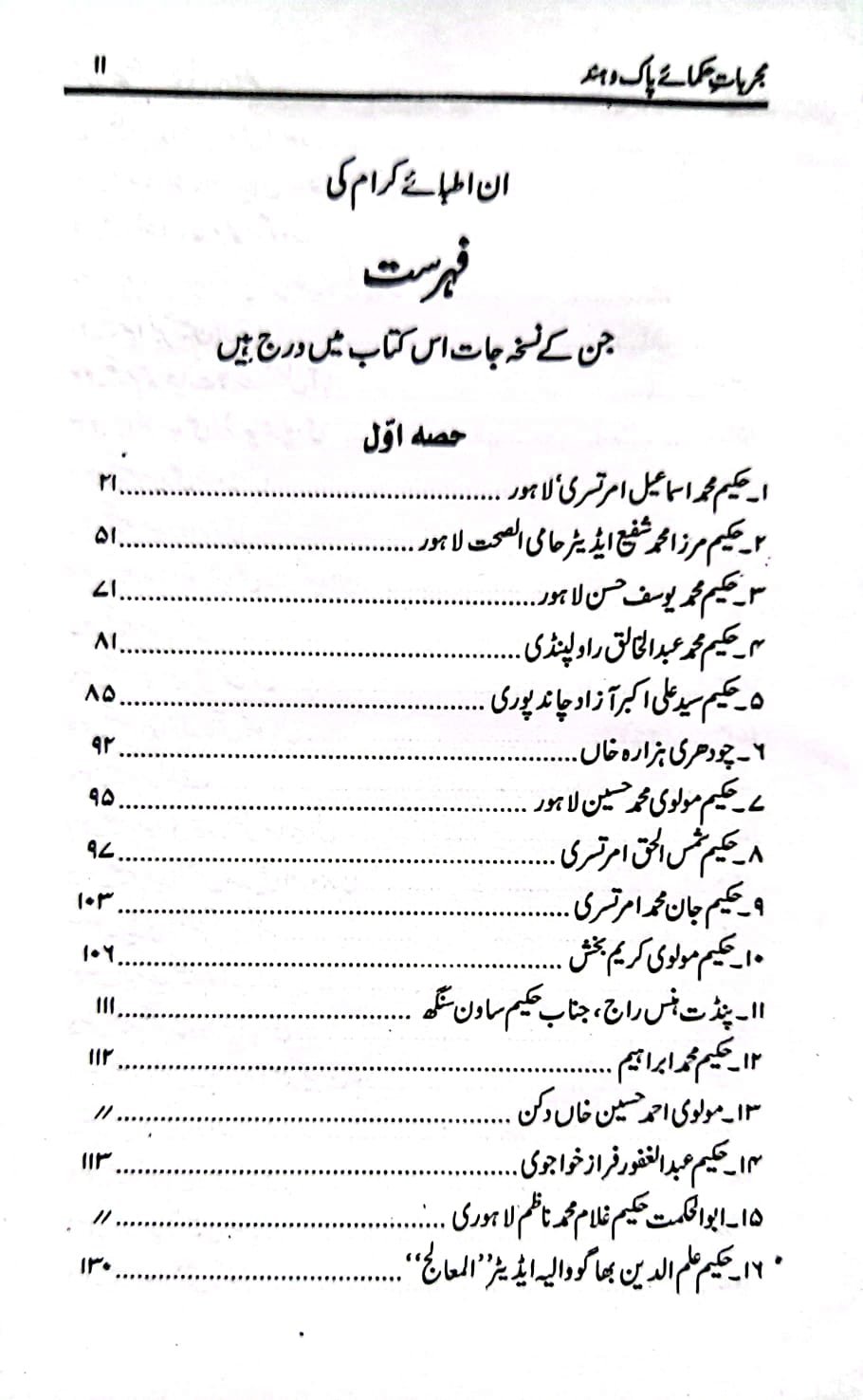 مجربات حکمائے پاک و ہند (ابوالسنیاس حکیم محمد اسمٰعیل امرتسری) برصغیر پاکستان و بھارت کے دو سو (۲۰۰)سے زائد اطبا کے دو ہزار سے زیادہ مجرب اور آزمودہ نسخہ جات اس کتاب میں درج ہیں۔ اس کے علاوہ اسرار نبض اور تشخیصی رموز پر بھی علیحدہ ابواب ہیں جن کے مطالعہ سے مریض کو دیکھ کر ہی مرض کی شناخت اور تشخیص کی جا سکتی ہے۔ یہ کتاب برصغیر کے دو مشہور طبی جریدوں ’’آب حیات‘‘ اور ’’حامی الصحت‘‘ کی فائلوں سے مرتب کی گئی ہے۔ جو اب کسی قیمت پر بھی دستیاب نہیں ہیں۔ ان کے علاوہ حکیم محمد اسمٰعیل صاحب نے ۱۹۷۶ء تک اپنے آزمودہ نسخہ جات درج کر دیے ہیں۔ پاکستان و ہندوستان کے معروف اور نامور حکماء کے تیر بہدف نسخہ جات اس کتاب میں آپ کو یک جا ملیں گے۔